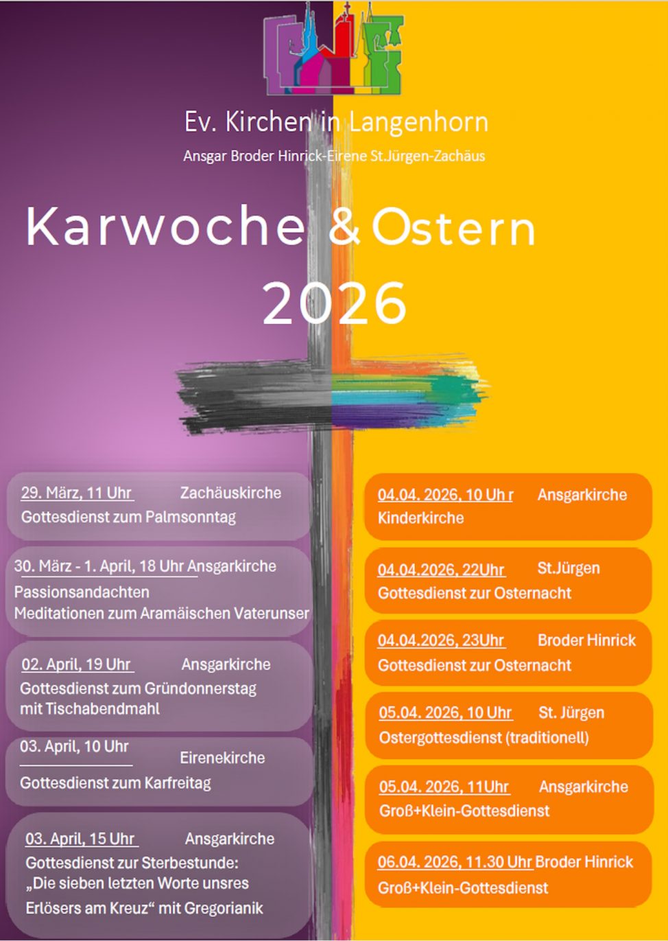 Kunterbunte Kinderkirche: von 10 bis 13 Uhr in der Ansgarkirche: wir singen – reden – hören Geschichten – spielen – basteln – essen und haben eine gute Zeit zusammen. Kinder dürfen gerne ihre Eltern oder Großeltern mitbringen. Termine: 04. April – Ostern / 09. Mai – Muttertag Es gibt die Möglichkeit, sich per Mail erinnern zu lassen. Bei Fragen oder … Read More